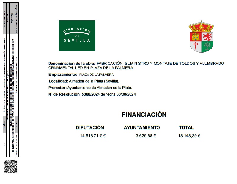 FABRICACIÓN, SUMINISTRO Y MONTAJE DE TOLDOS Y ALUMBRADO ORNAMENTAL LED EN PLAZA DE LA PALMERA