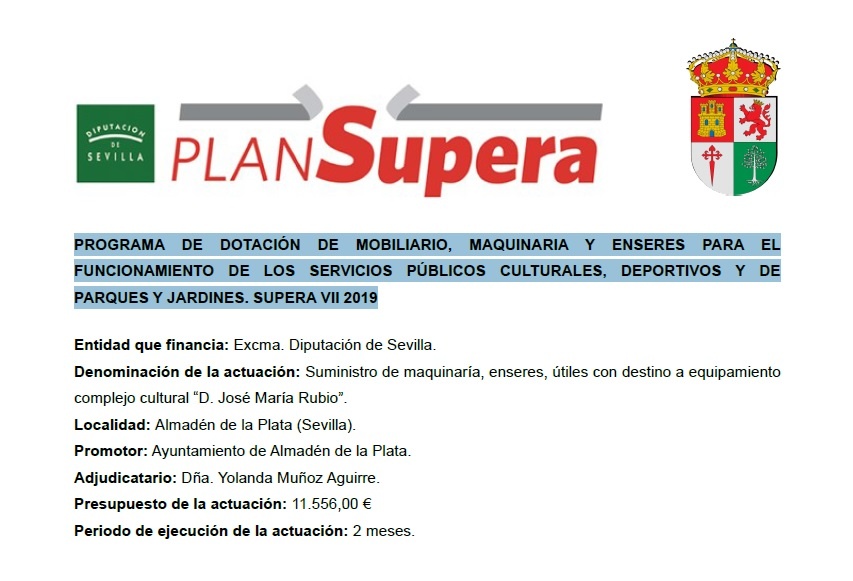 Denominación de la actuación: Suministro de maquinaría, enseres, útiles con destino a equipamiento complejo cultural “D. José María Rubio”. Presupuesto de la actuación: 11.556,00 € Periodo de ejecución de la actuación: 2 meses.